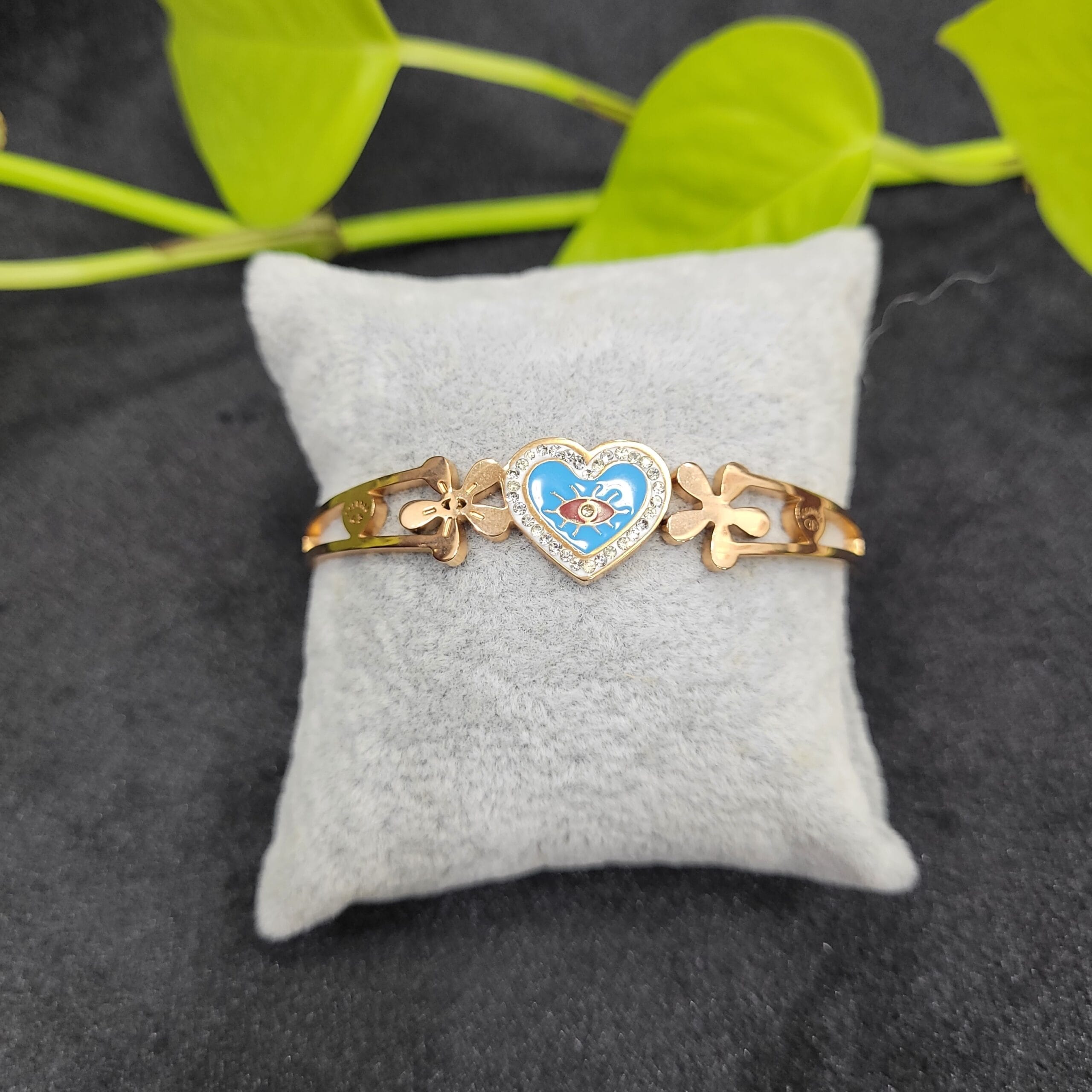 The heart-shaped centre with soft blue detailing adds a romantic and fashionable touch, making this bracelet an eye-catching accessory for any outfit.